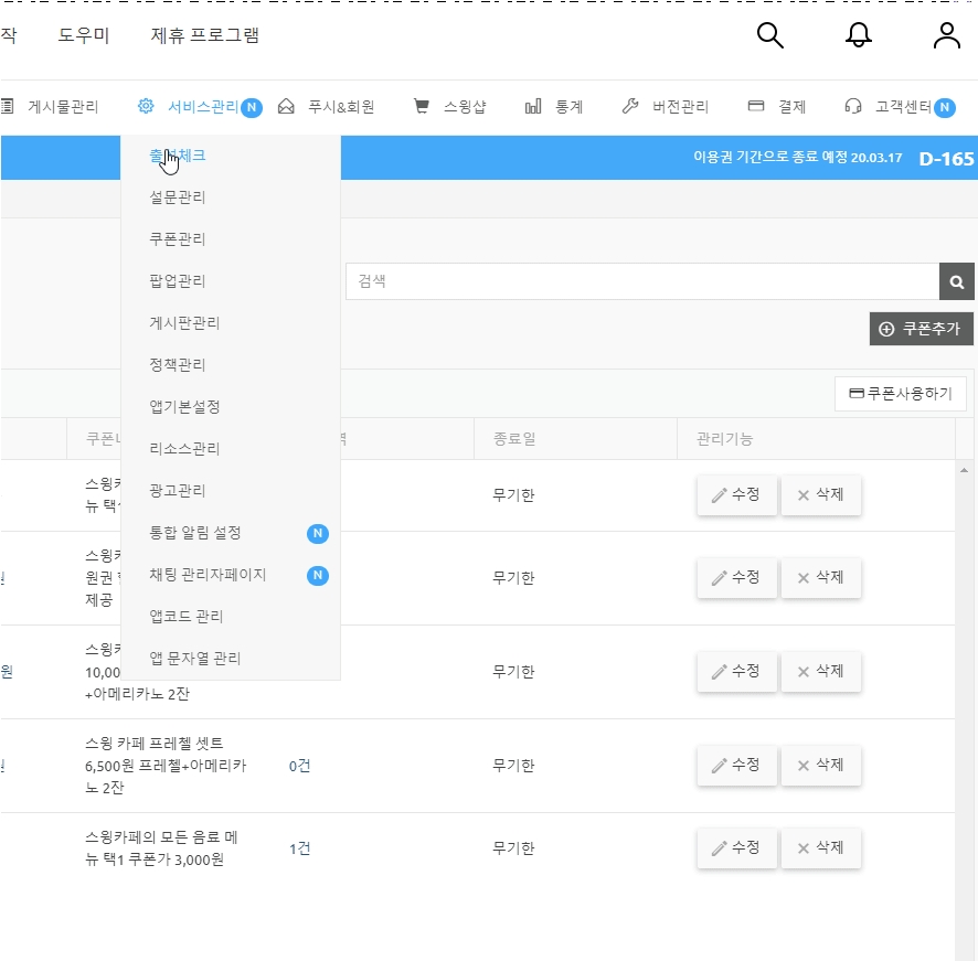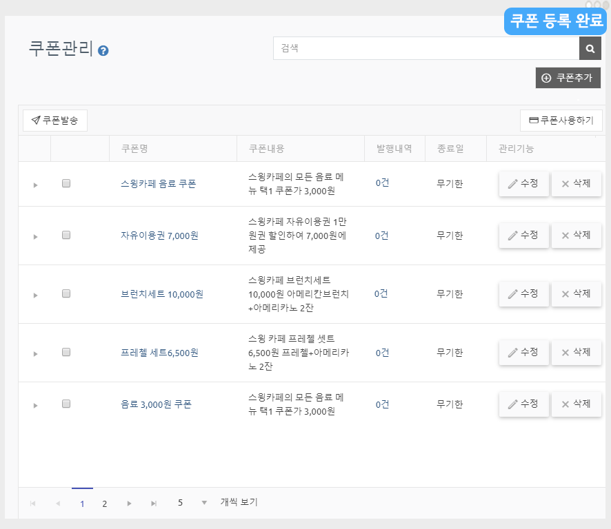 만들어진 쿠폰 오른쪽에는 관리 기능이 있어서 해당 쿠폰을 수정하거나, 삭제할 수도 있어요.