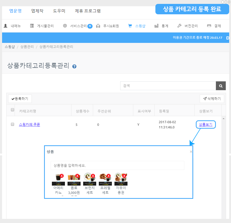 스윙 카페 샘플앱을 통해서 앱에 쿠폰 디지털제품이 어떻게 등록되었는지 확인해주세요.