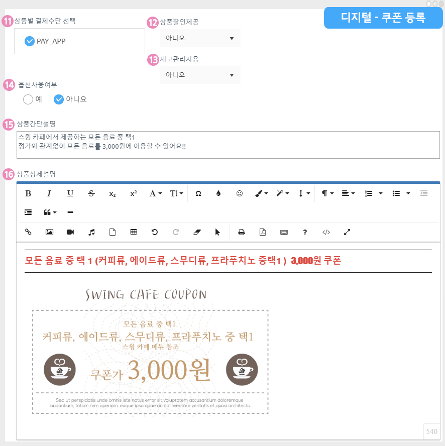 디지털 제품 중 쿠폰 판매는, 쿠폰을 등록하여 앱 사용자들에게 해당 쿠폰을 판매할 수 있는데요.
