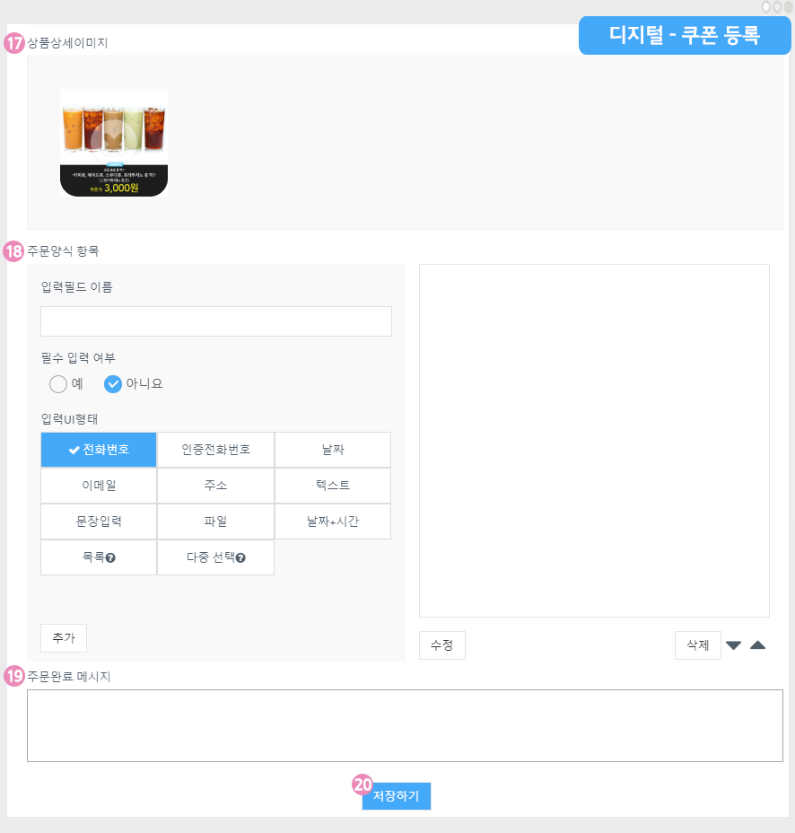 18. 주문양식 항목: 주문양식은 특별히 더 받아야 할 정보가 있다면 입력을 해주시고, 그렇지 않으면 작성하지 않아도 됩니다.