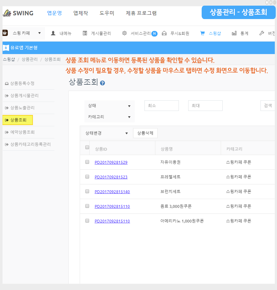 상품조회 메뉴에서 등록한 상품 목록을 모두 확인할 수 있구요.