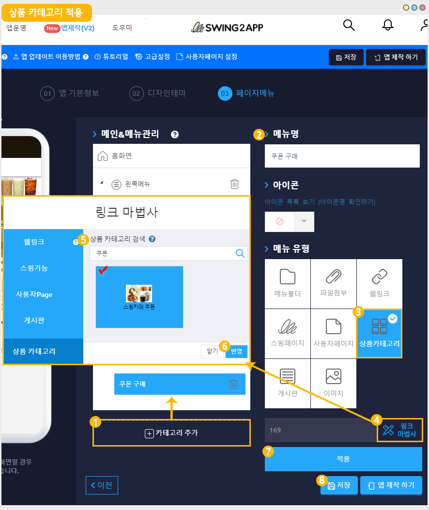 *쿠폰 확인 메뉴는 앱제작 페이지 – 페이지 메뉴- 스윙페이지에서 적용할 수 있어요!