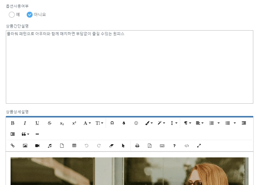 예시)의류 쇼핑몰: 사이즈 추가, 색상 추가 등을 기재해서 옵션을 설정하고 옵션금액을 설정할 수 있습니다.