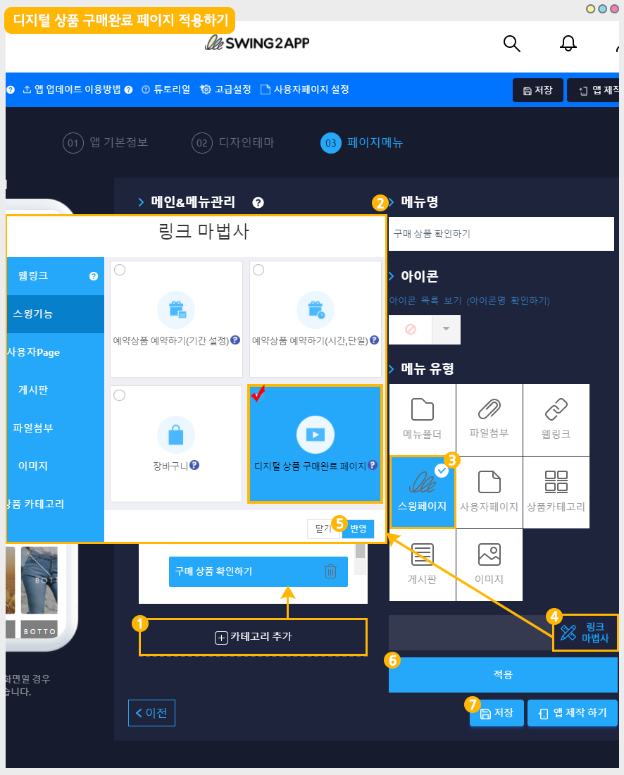 3. 메뉴 유형: [스윙페이지]를 선택해주세요.