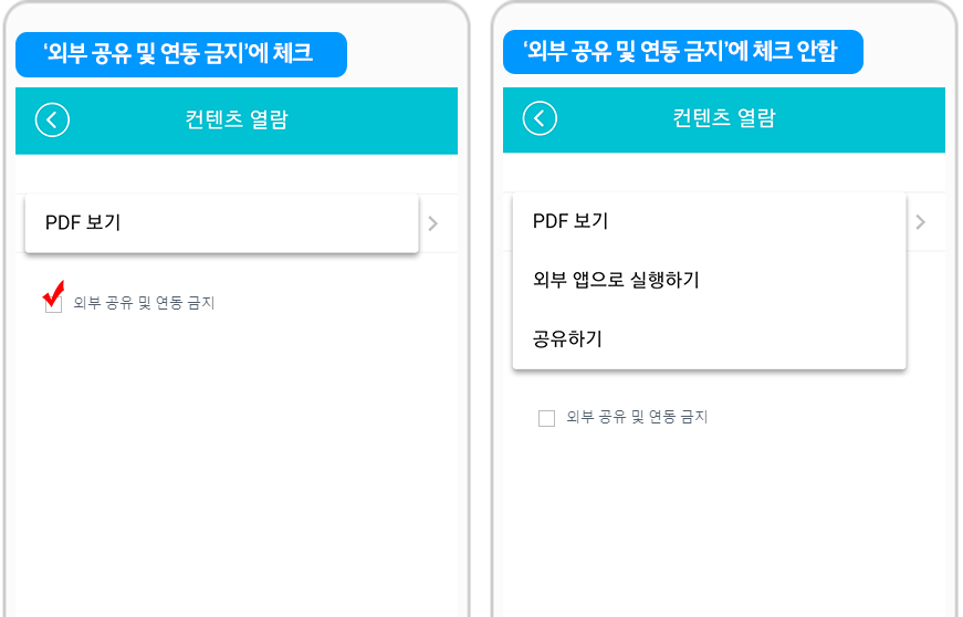 -구매한 PDF 파일을 공유할 수 없고, 앱에서만 확인하도록 설정하고 싶다면 ‘외부 공유 및 연동 금지’ 체크해주세요