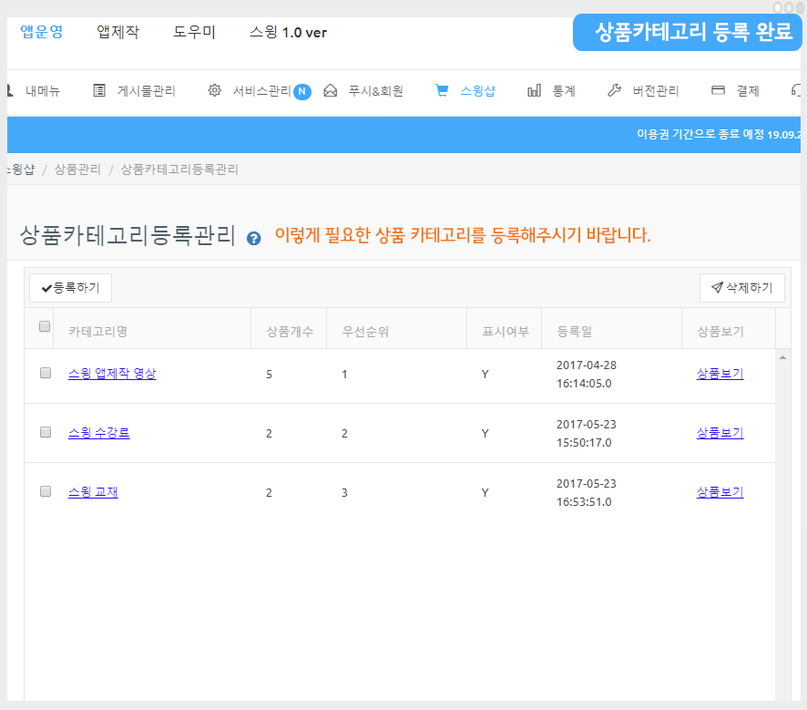 [스윙샵]이 생성되었다면, 먼저 상품 카테고리를 등록해야 합니다.