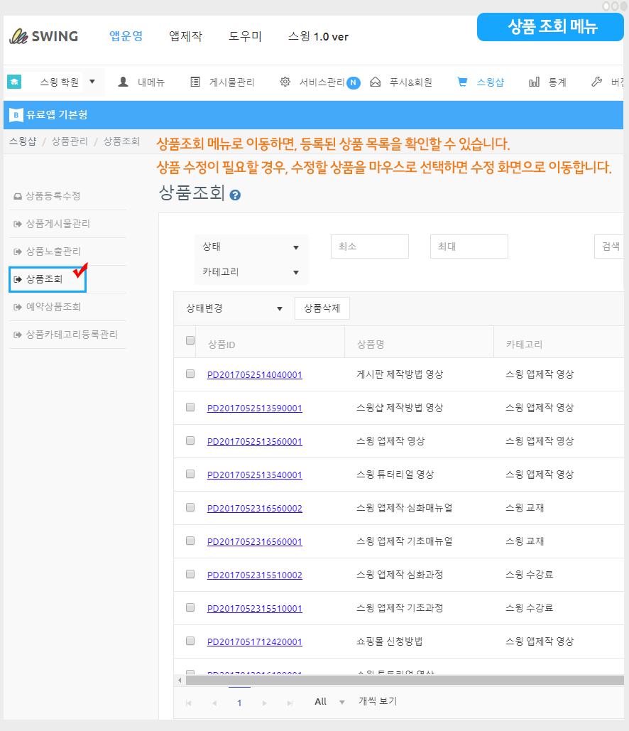 상품조회 메뉴에서 등록한 상품 목록을 모두 확인할 수 있구요.