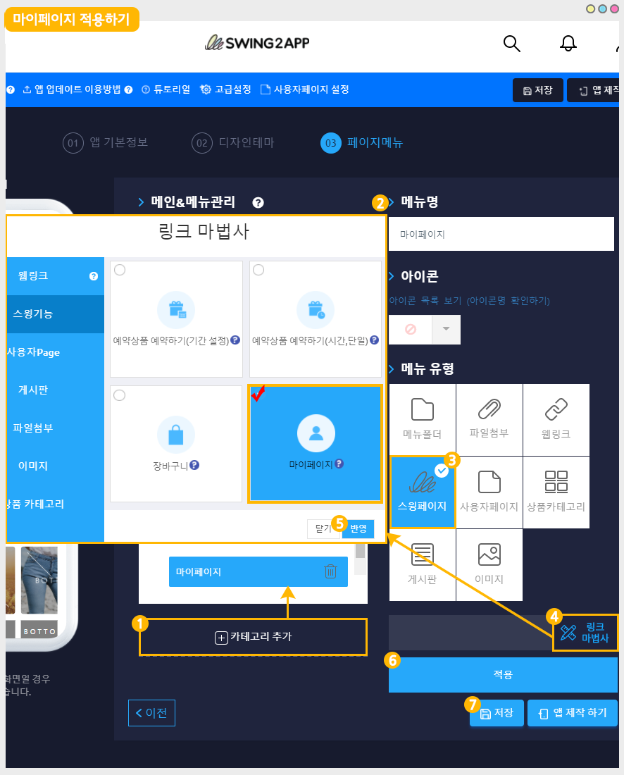 마이페이지는 앱제작에서 스윙페이지에서 마이페이지를 앱에 적용해주셔야 앱에서 이용이 가능합니다.
