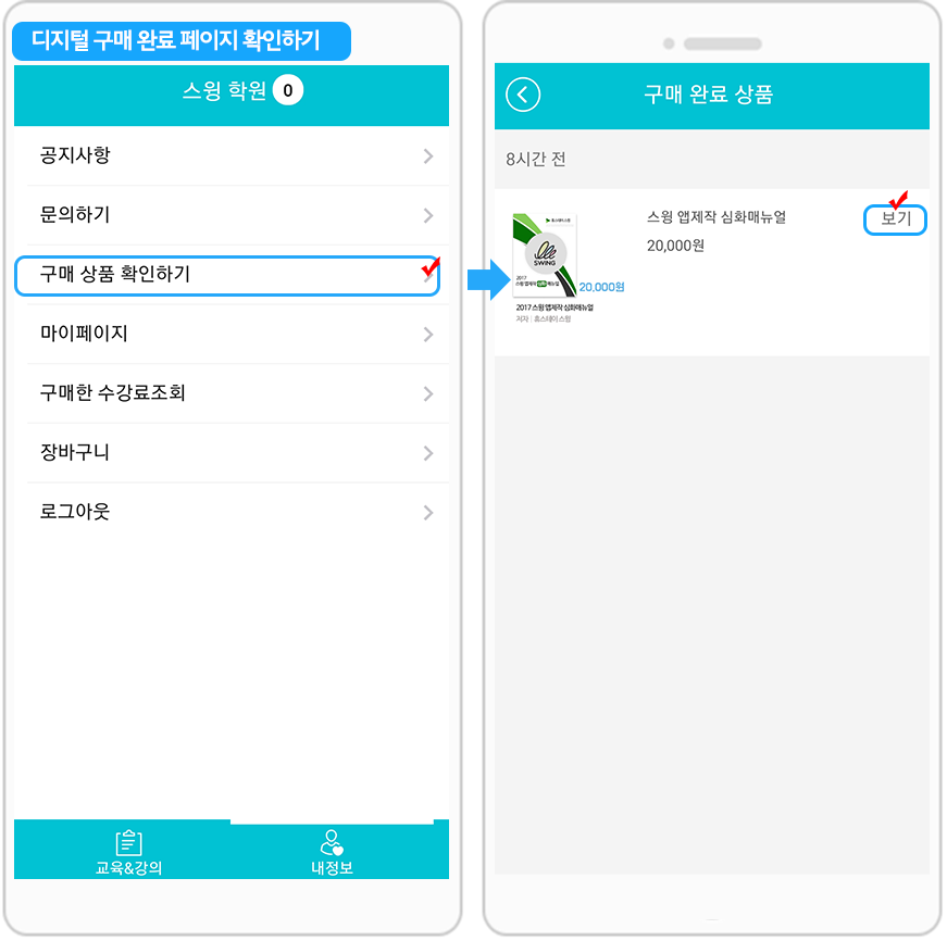 아래 이용방법 화면을 보시고 앱 메뉴에 구매완료 페이지를 추가해주세요.