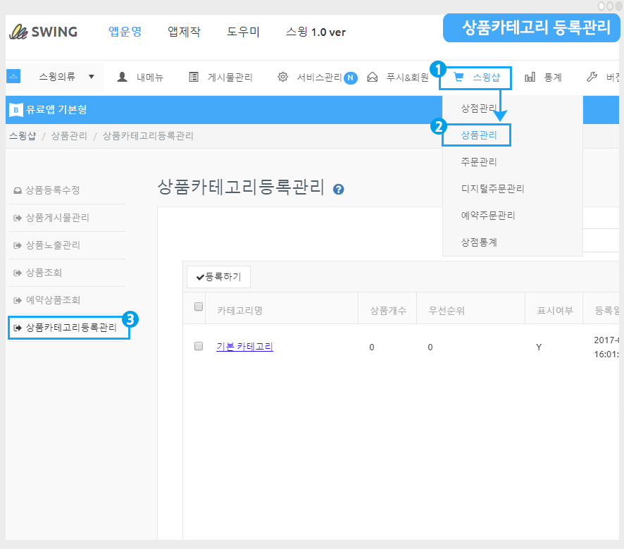 스윙샵 → 상품관리→ 상품카테고리 등록관리 메뉴로 이동합니다.