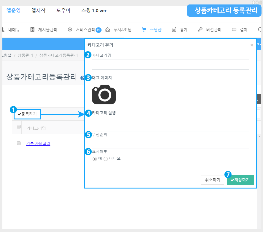 카테고리 관리 창에서 2)카테고리명 2) 대표이미지 3)카테고리 설명 5)우선순위 6)표시여부 체크 7) 저장하기 버튼을 선택합니다.