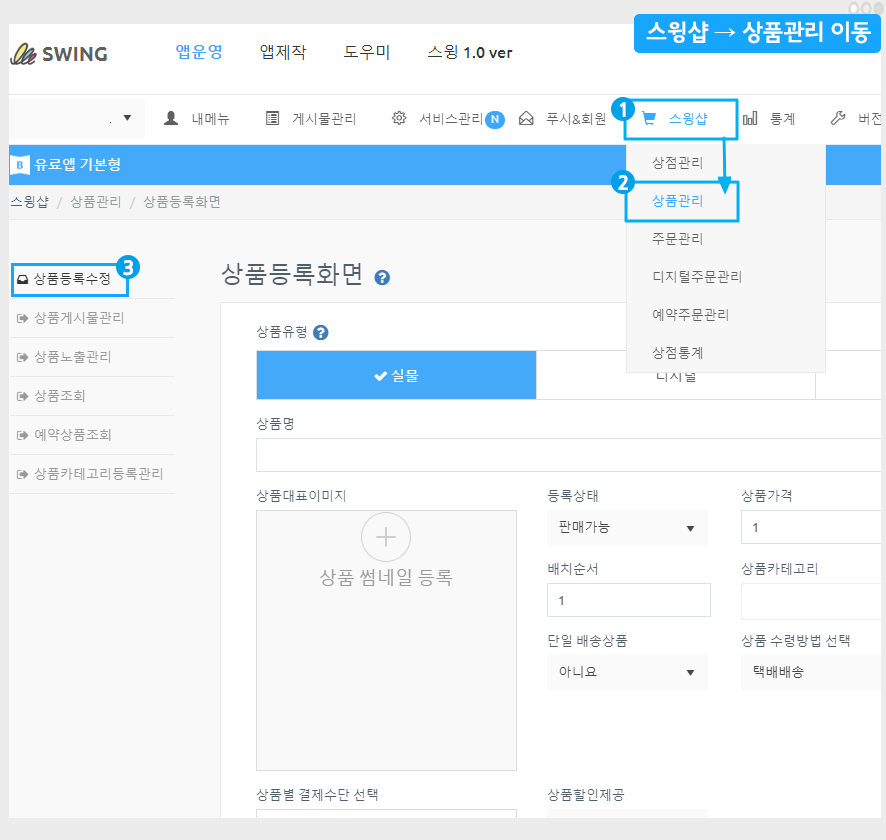 스윙샵 → 상품관리 → 상품등록 화면으로 이동해주세요.