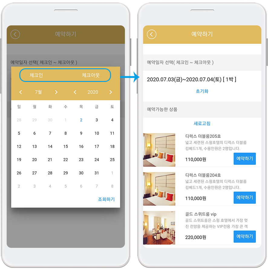 날짜 조회가 완료되면 해당 날짜에 예약가능한 상품이 조회됩니다.