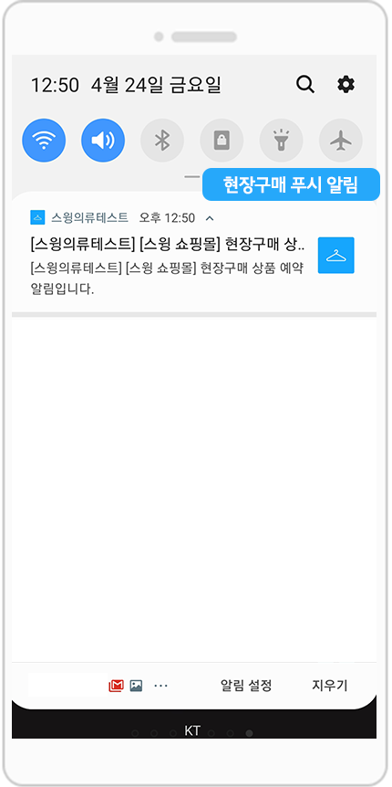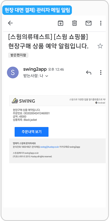 다른 결제 수단과 동일하게 앱 운영자(관리자)에게 현장 구매 푸시 알림, 메일이 발송되요.