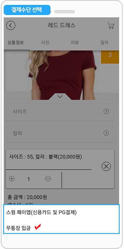 쇼핑몰앱 결제수단: 페이앱, 무통장입금, 대면결제 진행화면