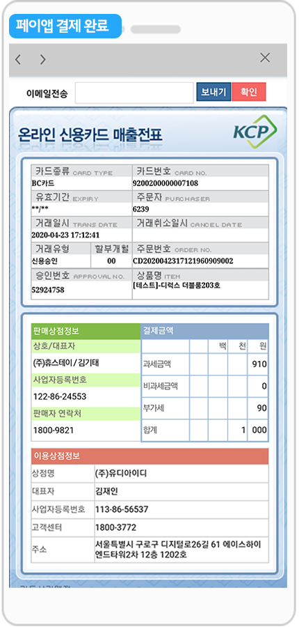 쇼핑몰 앱에서 결제수단별 결제화면이 어떻게 보여지는지 확인해주세요.
