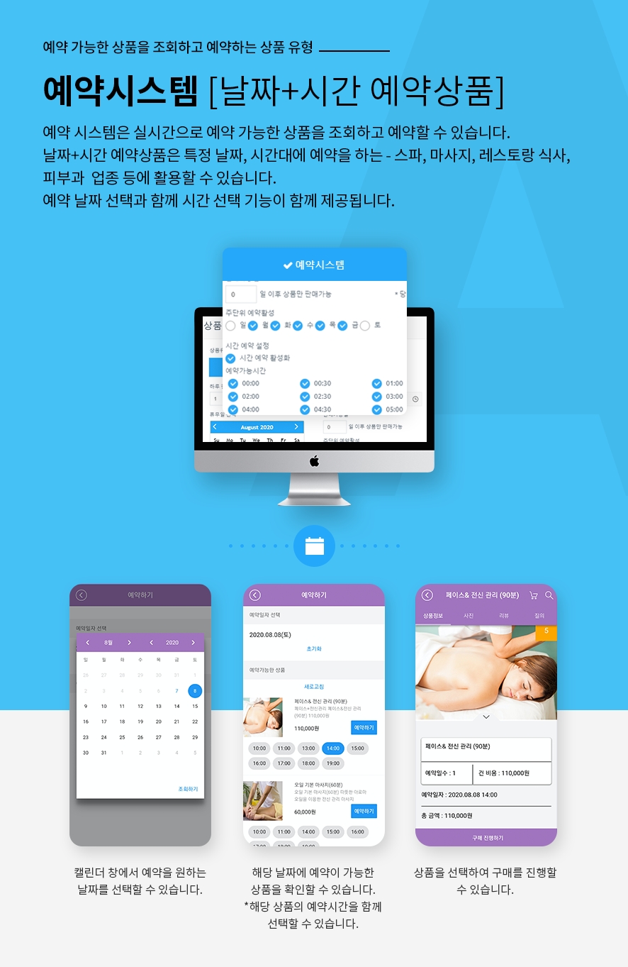시간대를 선택하여 예약할 수 있기 때문에 레스토랑, 마사지, 병원, 스파 등의 업종에서 활용할 수 있습니다.