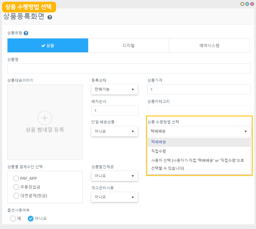 실물 상품 등록시) 관리자가 상품등록 페이지에서 [상품 수령 방법]을 선택할 수 있습니다.