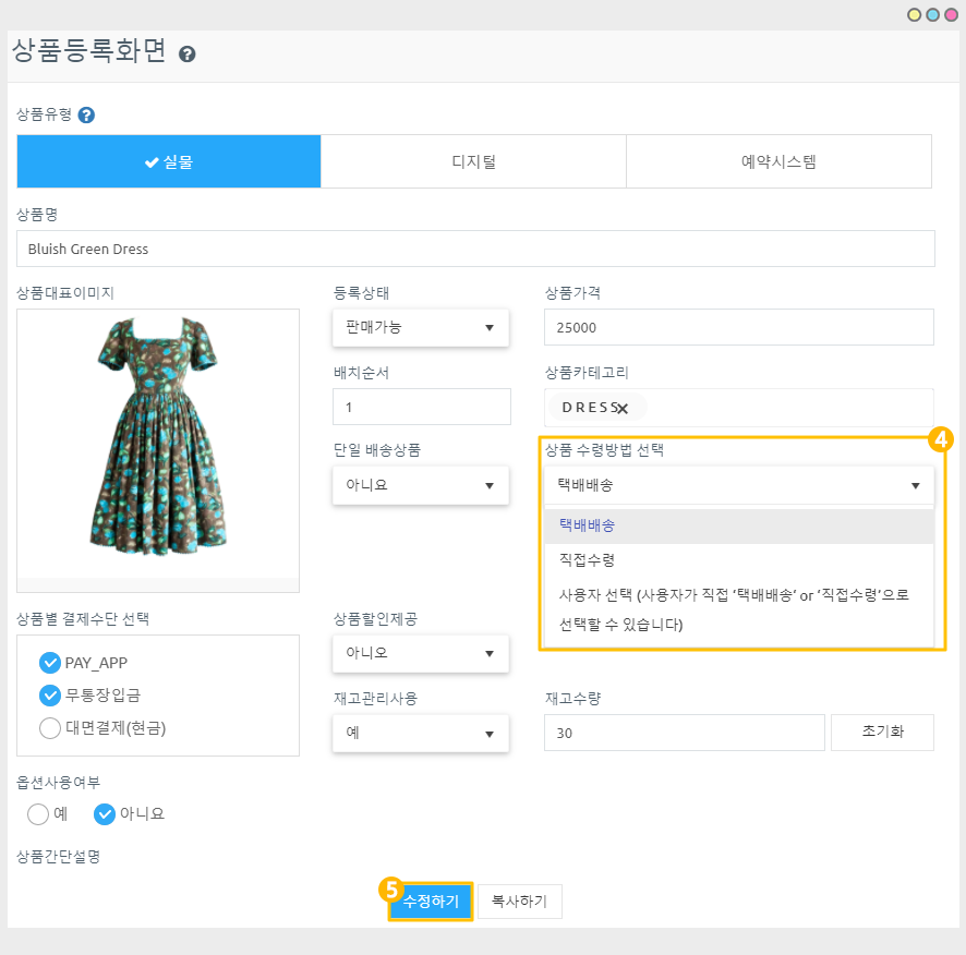 2) 등록된 상품에서 수령방법 수정하기
