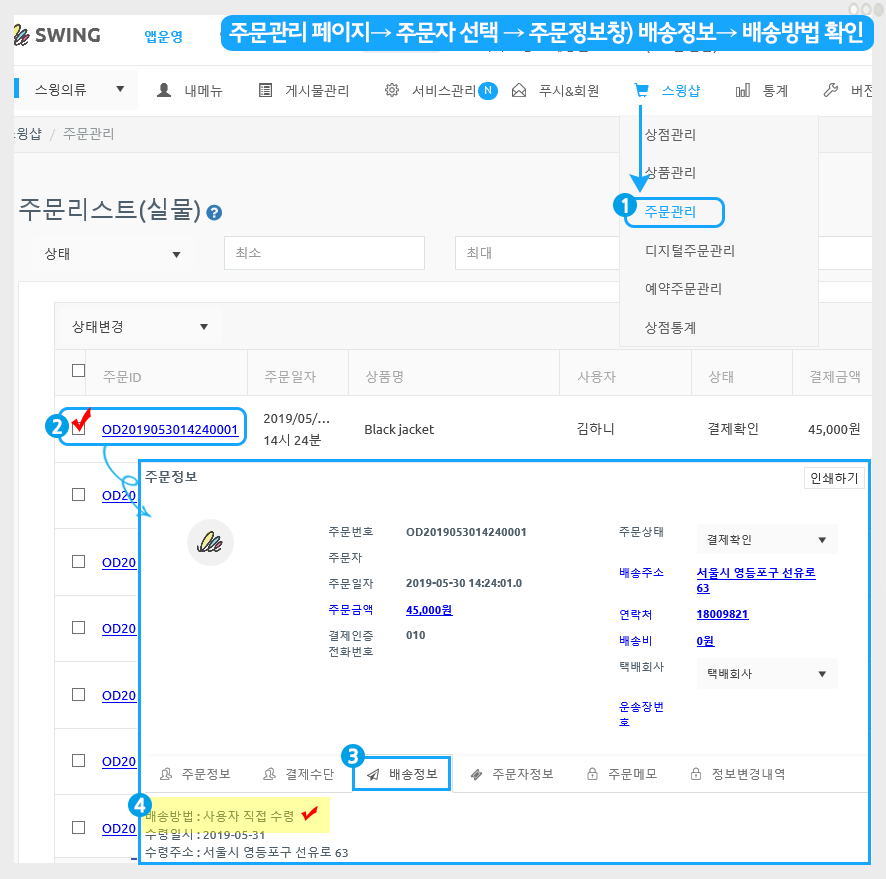 4) 주문자가 선택한 배송방법을 확인할 수 있습니다.