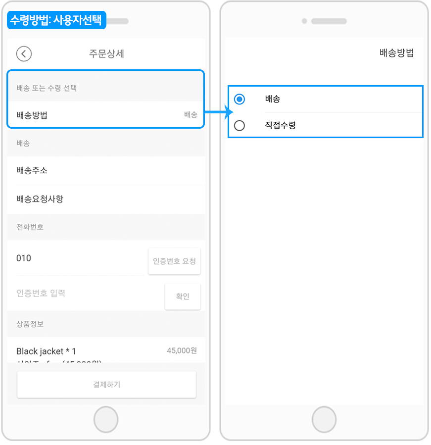 -‘사용자 선택’ 항목도 추가해서 사용자가 앱에서 직접 수령방법을 선택할 수도 있습니다.
