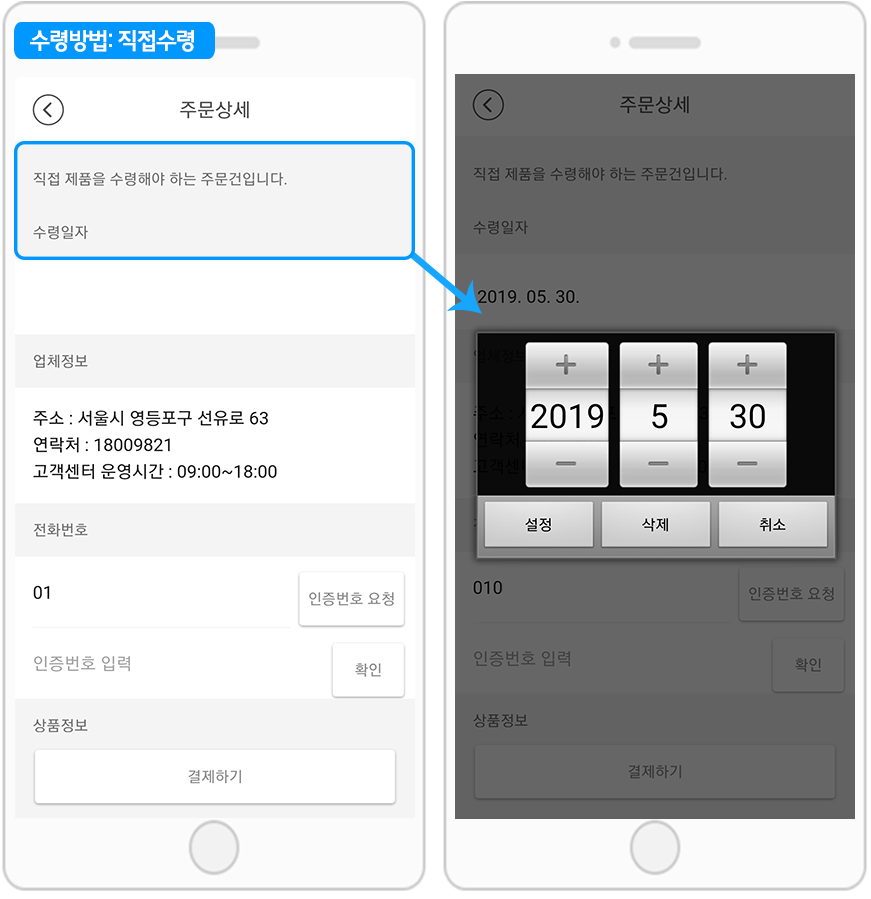 선택한 수령방법에 따라서 주문상세 페이지 내용이 바뀌게 됩니다.