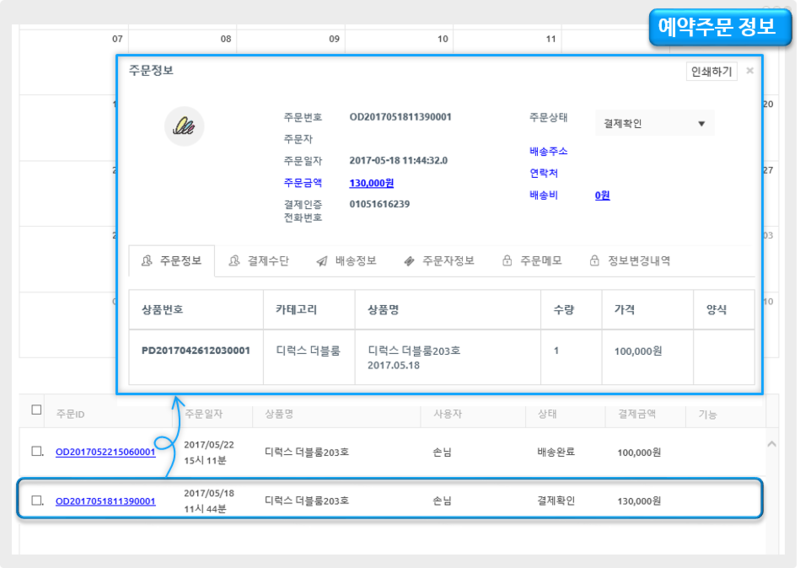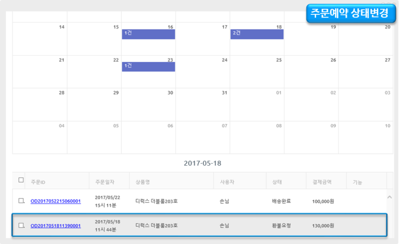 캘린더의 파란색 영역을 선택하면, 캘린더 아래로 주문 목록이 뜨구요.