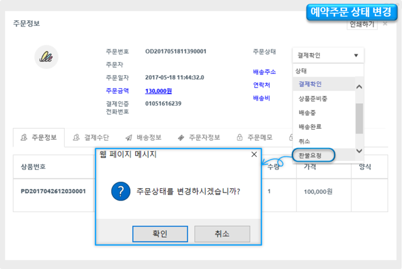 확인을 누르면, 예약주문 상품의 상태가 [환불요청]으로 변경된 것을 확인할 수 있습니다.