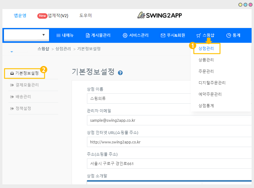스윙샵 1)상점관리 메뉴 – 2)기본정보설정 메뉴로 이동합니다.