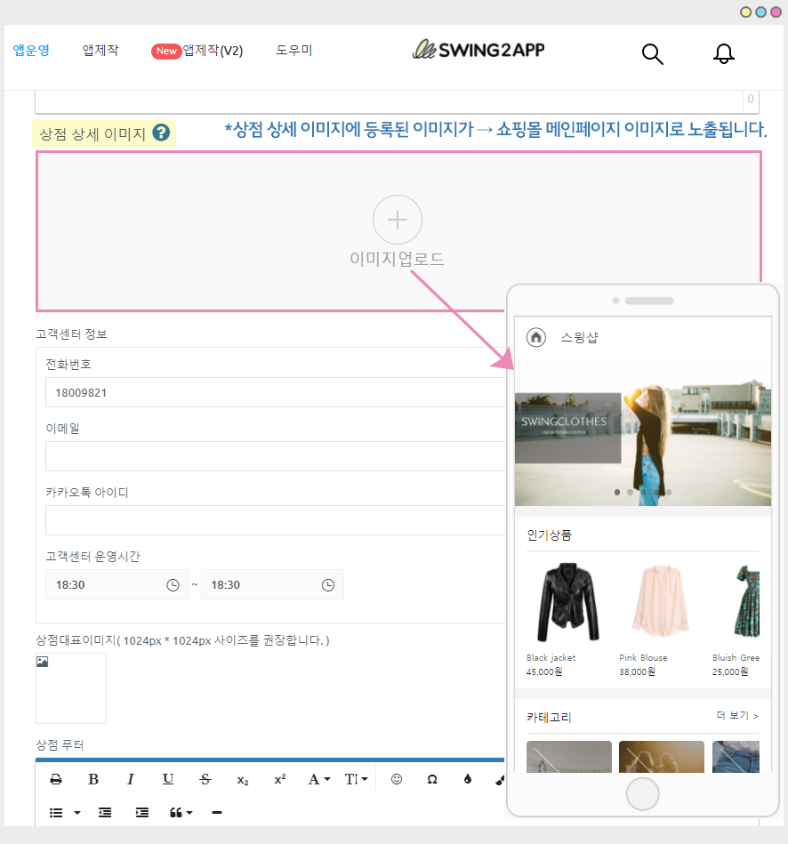 매뉴얼을 참고하셔서 스윙샵 이용시) 쇼핑몰 메인페이지를 이용하고 적용하는 방법을 확인해주세요 ^^