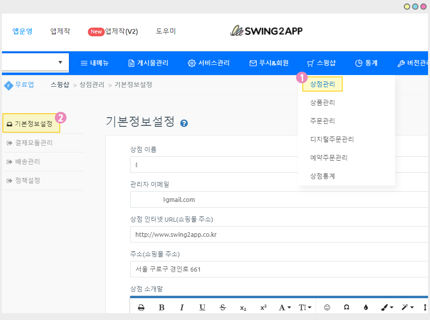 1)스윙샵 상점관리 → 2)기본정보 설정 페이지로 이동해주세요.