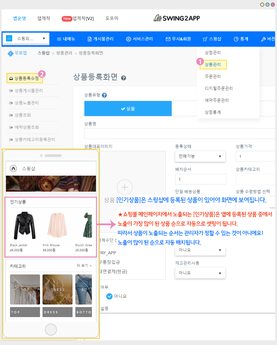 1)스윙샵 상품관리 → 2)상품 등록 화면 페이지로 이동해서 상품을 등록해주세요.
