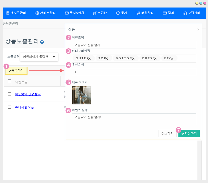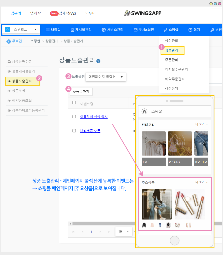 1)스윙샵 상품관리 → 2)상품 노출관리 → 3)노출유형: 메인페이지-콜렉션 → 4)이벤트를 등록하면, 쇼핑몰 메인 페이지의 ‘주요상품’ 항목으로 노출됩니다.