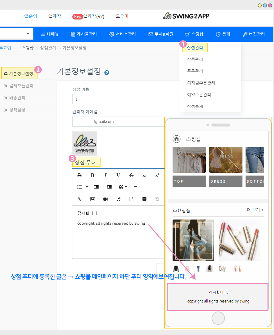 해당 메시지는 1)스윙샵 상점관리 → 2)기본정보 설정 → 3)상점 푸터에서 수정 및 등록할 수 있어요.