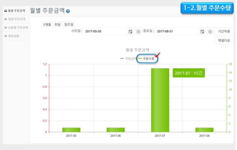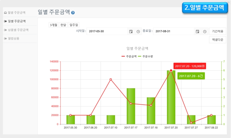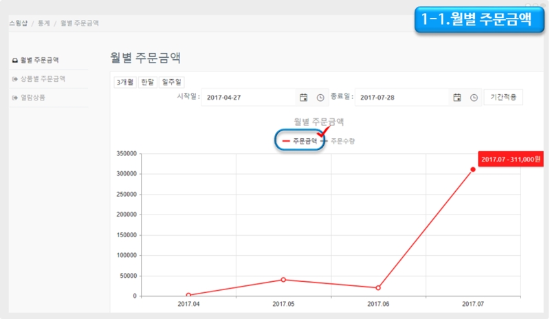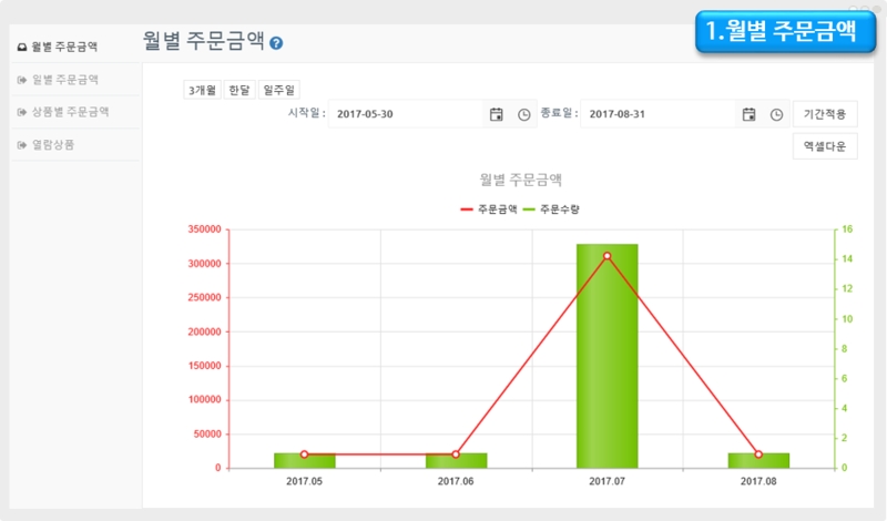 기간별 주문금액, 주문 수량을 확인할 수 있구요.