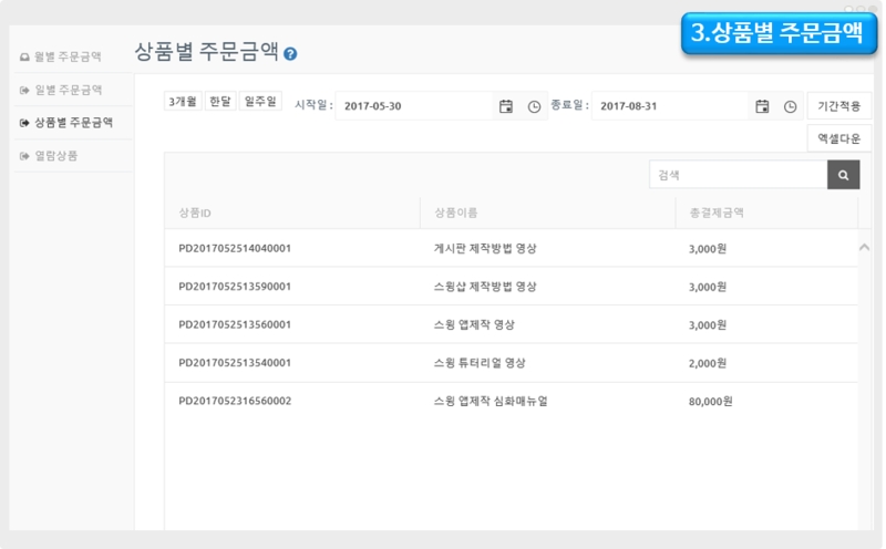기간을 적용하면 해당 기간 동안 주문한 상품별 총 결제금액을 확인할 수 있습니다.