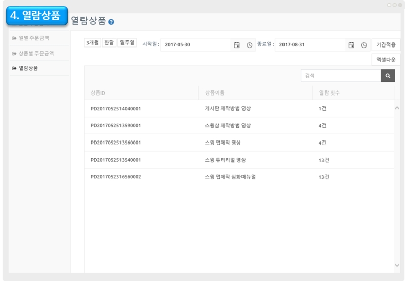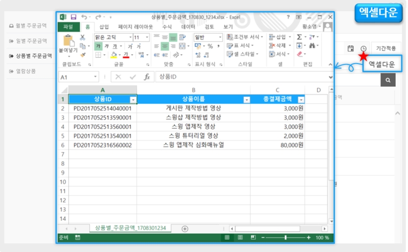 문서화를 하실 경우 엑셀다운 받기를 통해서 상품별 통계현황을 확인해주세요.