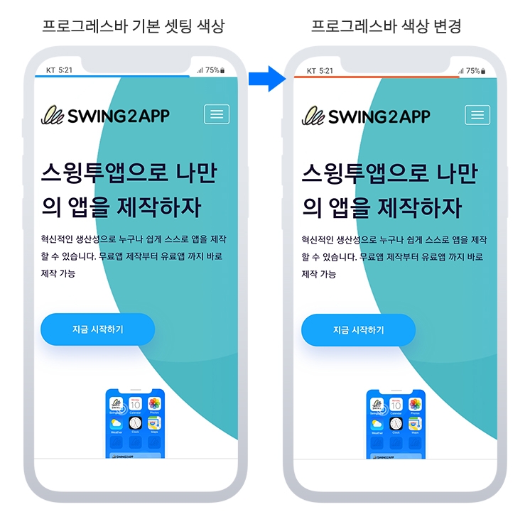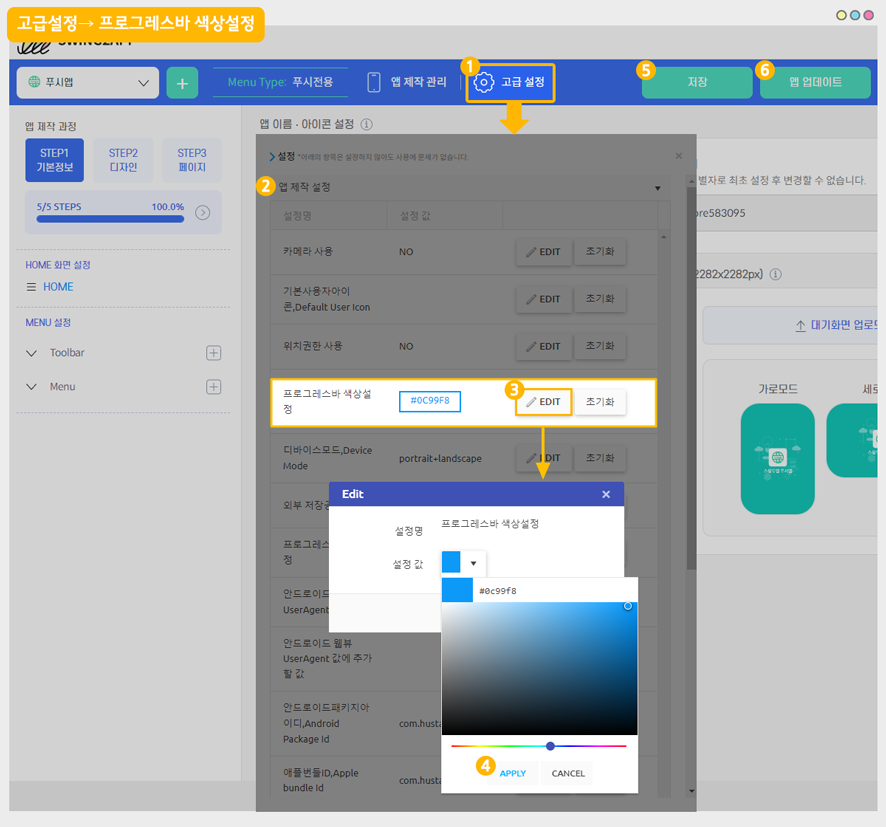 3)프로그레스바 색상 설정 기능은 웹사이트를 연결한 웹앱 – 웹뷰, 푸시앱에서 이용 가능한 기능입니다.