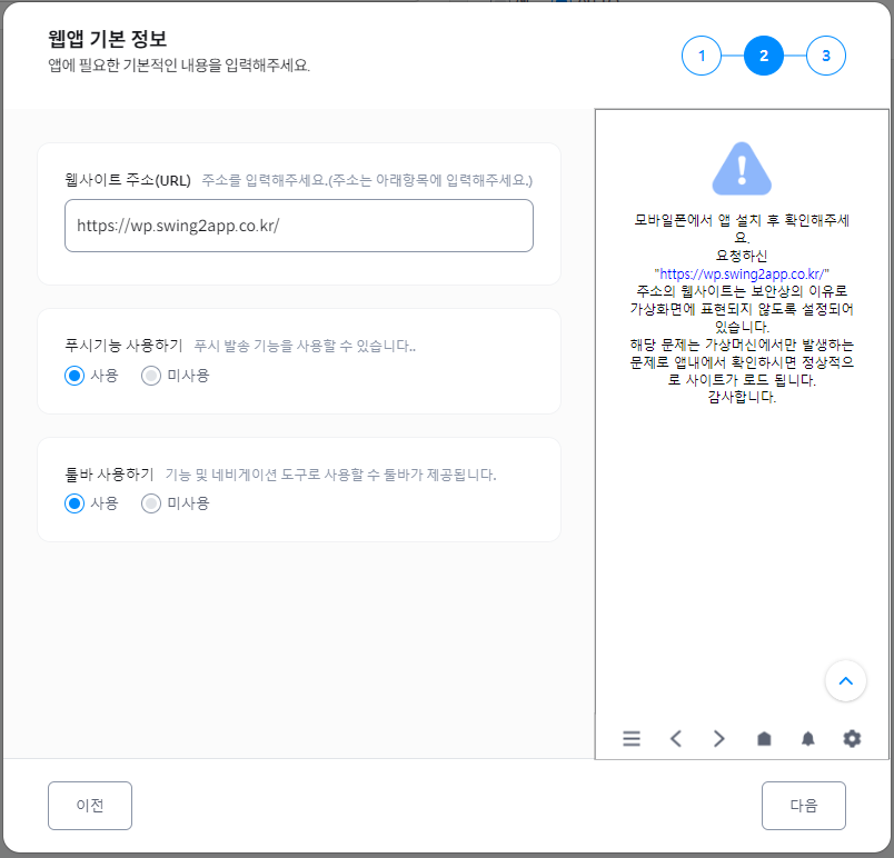 STEP3 페이지 단계는 앱에 적용할 웹사이트 링크를 입력하게 되는데 해당 내용도 이미 앱제작 마법사에서 등록을 했어요.